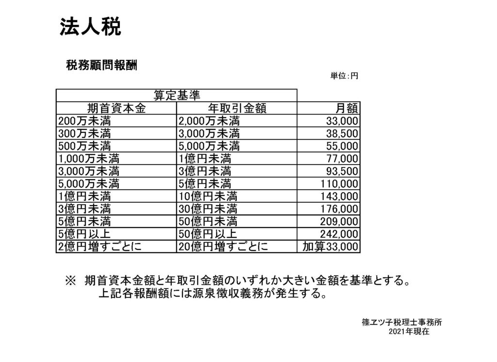 顧問料および決算料以外の報酬については以下をご参照ください。